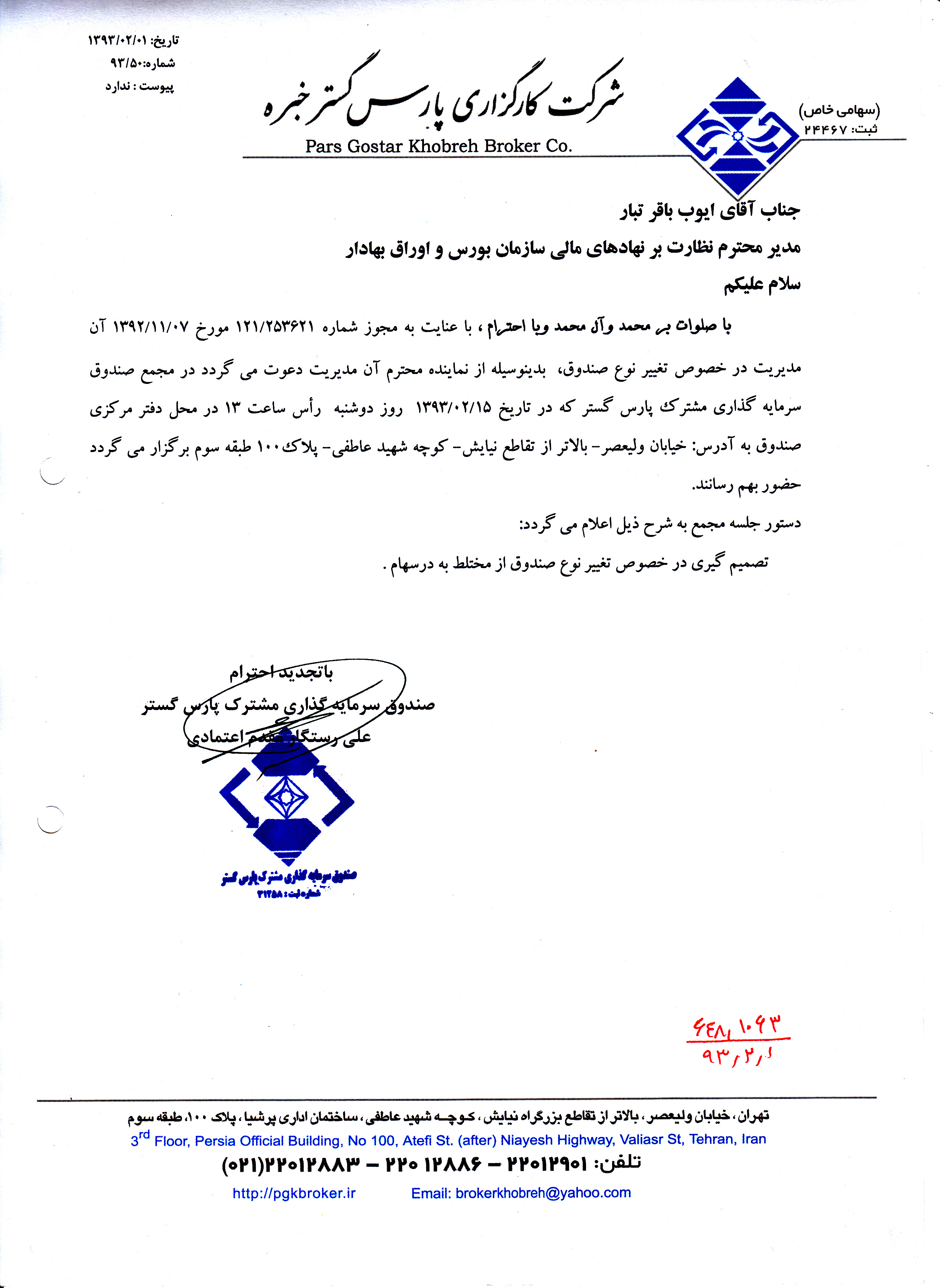 | 201 | آگهی دعوت به مجمع مورخ 1393/02/15 ساعت 13:00 در خصوص تغییر ماهیت صندوق از مختلط به سهامی | ۱۳۹۳/۰۲/۱۵ |