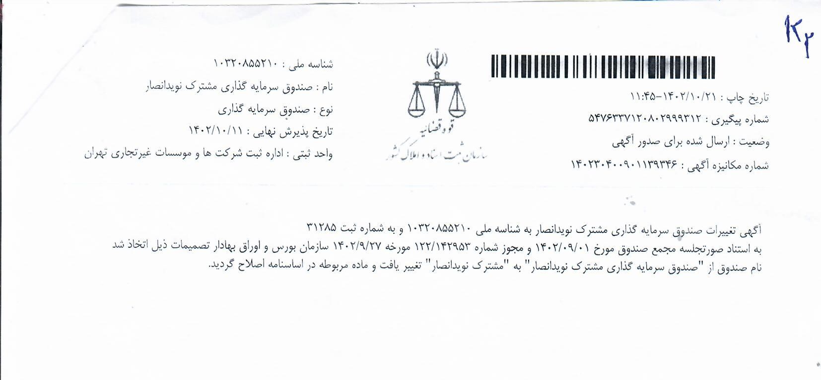آگهی تغییرات مورخ 1402/10/11صندوق سرمایه گذاری مشترک نوید انصار