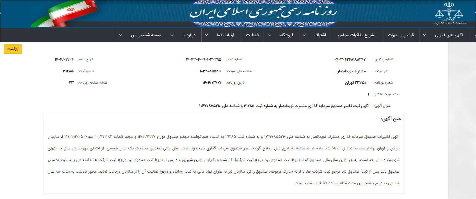 روزنامه رسمی مجمع عمومی سالیانه مورخ ۱۴۰۳.۰۹.۱۱ صندوق نوید انصار ((تصویب صوزرتهای مالی و انتخاب حسابرس)